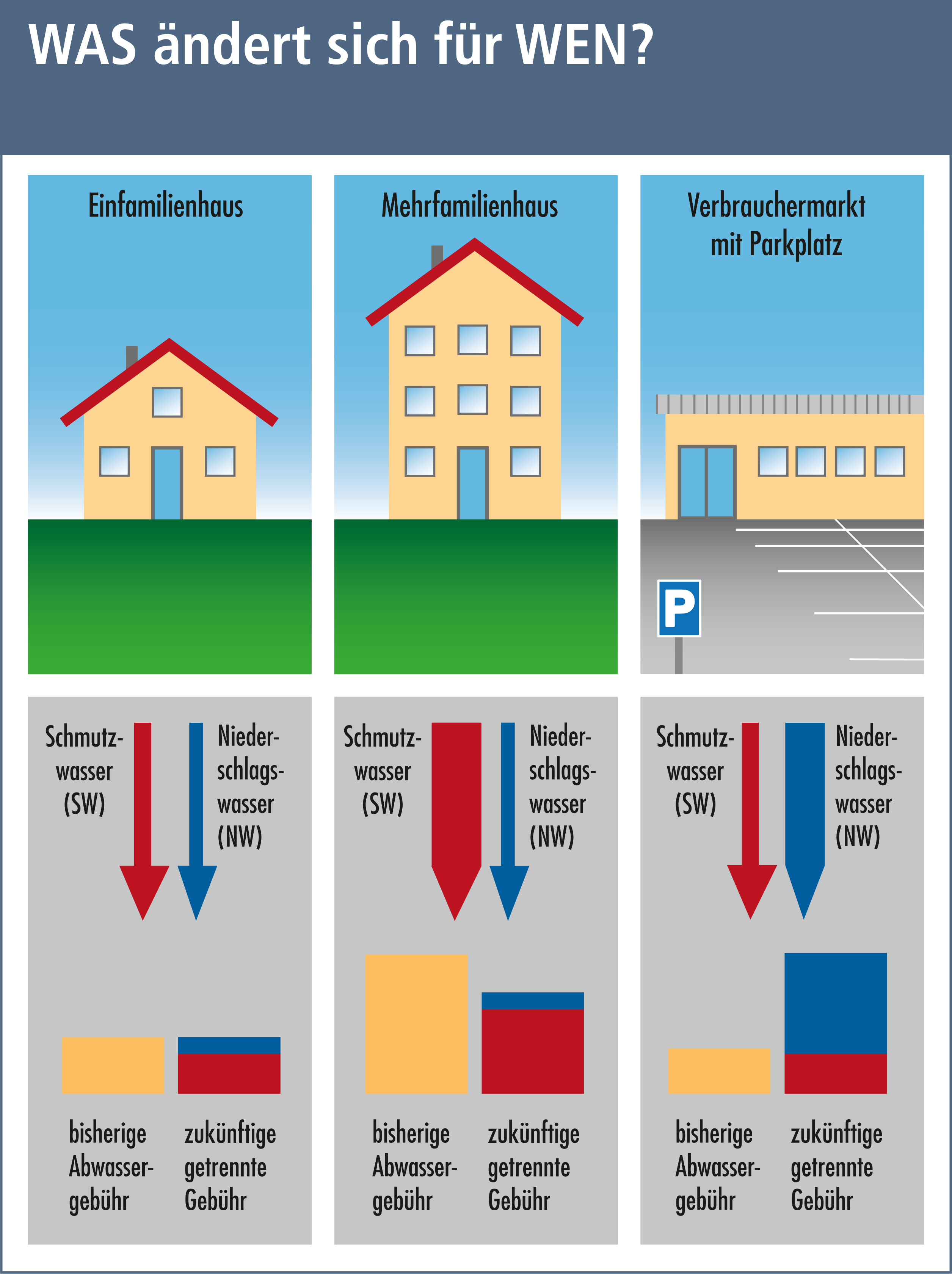 - von mehrgeschossigen Häusern, mit einem geringen Anteil an versiegelter Fläche die Abwassergebühren eher niedriger ausfallen als vor der Einführung der getrennten Gebühr (mittig im Bild).